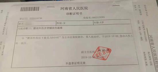 据彤彤妈妈李女士介绍,女儿在郏县王集乡舞蹈学校学习舞蹈已有两年时间。10月6日早上8点左右,爷爷把孩子送去学舞蹈,11点左右,她接到消息,孩子送进当地医院了。当天,彤彤从当地医院转院至河南省人民医院治疗,经医院诊断为“腰部外伤并脊髓损伤截瘫”。