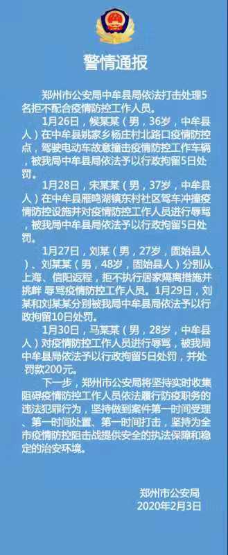 1月30日,马某某(男,28岁,中牟县人)对疫情防控工作人员进行辱骂,被依法予以行政拘留5日处罚,并处罚款200元。