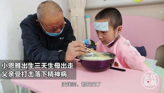 病床上的小女孩叫何恩雅,来自河南省周口市西华县一个偏远的农村,小恩雅出生于2009年3月4日,画面里给小恩雅喂饭的爷爷叫何记山。