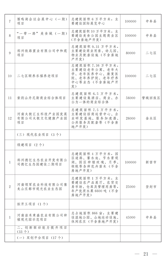 1月21日,郑州市政府官网公布了《郑州市人民政府办公厅关于全市2018年省市重点项目建设情况的通报》(以下简称“通报”)和《郑州市人民政府关于下达2019年度郑州市重点建设项目的通知》(以下简称“通知”)两份文件。根据两份文件,2018年郑州市承担的省市重点项目均圆满完成年度目标任务,2019年,市级重点项目为397个,包含多个城市商业综合体及学校。