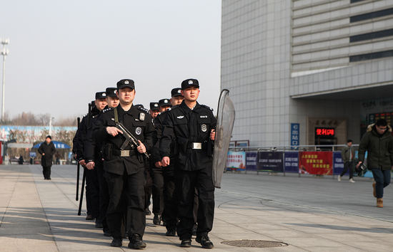 在信阳东站,广场上来回武装巡逻的铁警威严戒备、应急处突,严格确保旅客安全。