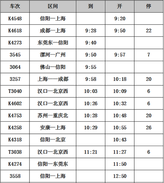 1.K4548次,信阳-上海,信阳站9:20开;