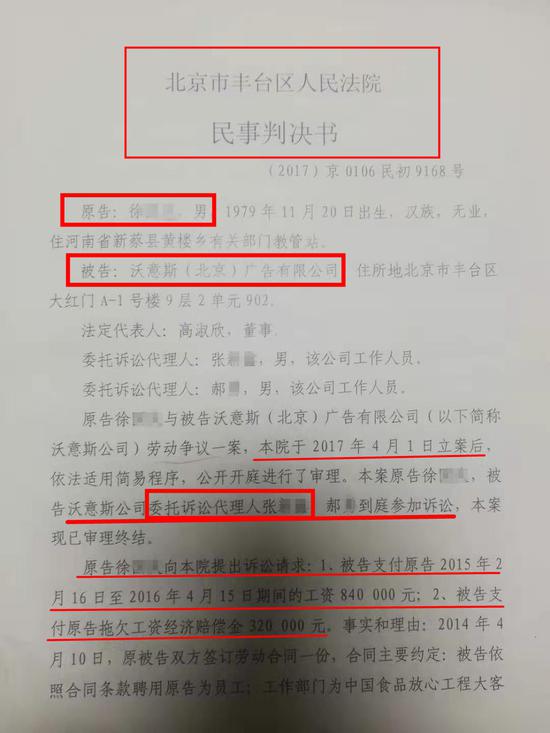 2017年6月22日,北京市丰台区人民法院对徐先生的起诉作出判决,判决沃意斯(北京)广告有限公司于判决生效7日内支付徐先生2015年2月16日至2016年4月15日期间工资84万元。但判决至今,徐先生仍未收到自己应得的薪资,徐先生称,在讨薪期间,对方不仅通过转移公司法人和原股东、减少公司注册资本、申请破产等方式逃避责任,更是对徐先生冷嘲热讽、疯狂辱骂,甚至称:“随你折腾,你还算个人吗?”