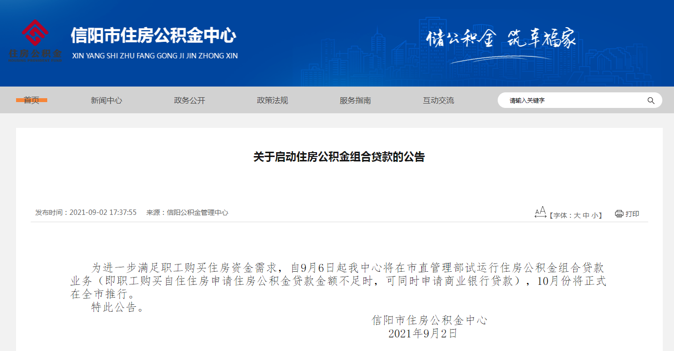 9月2日信阳市住房公积金中心消息,为进一步满足职工购买住房资金需求,自9月6日起信阳市住房公积金中心将在市直管理部试运行住房公积金组合贷款业务(即职工购买自住住房申请住房公积金贷款金额不足时,可同时申请商业银行贷款),10月份将正式在全市推行。
