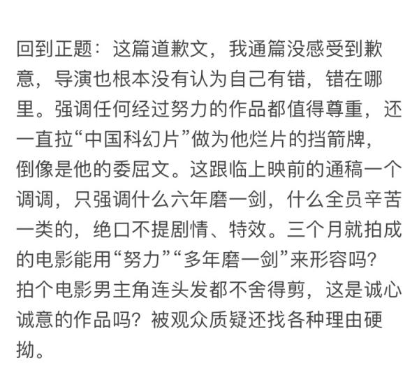 8月11日上午,导演滕华涛在微博上向观众发出一段道歉的文字,表示自己“很难受,但这就是一个没有做好事情的人,应该有的感受,我会记住。希望还有以后,也希望中国科幻电影可以越来越好”。