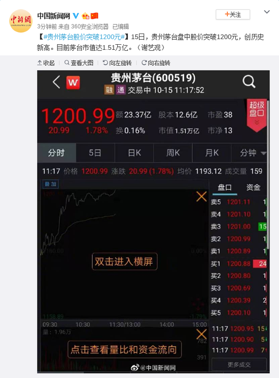 15日,贵州茅台盘中股价突破1200元,创历史新高。目前茅台市值达1.51万亿。
