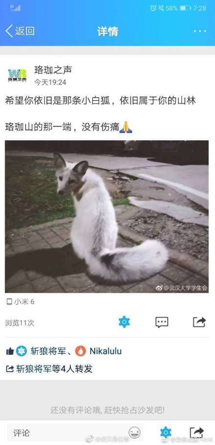 武汉大学的小白狐“珈珈”,曾经俘获无数人心,18年9月28日晚,它在学校外被撞身亡。该校动物保护协会的同学们将白狐遗体安葬在学校附近的珞珈山上,有参与救助的同学伤心哭泣。