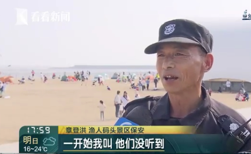 据他回忆,当时两名当事人距离岸边比较远,且当天风力较大,在呼喊了数分钟仍未见效果后,老张又朝着两人挥手示意。但两人朝着岸边没走几步,又停了下来。老章见状,准备下海将两人劝回。看到保安师傅的这一举动,这对年轻情侣才回到岸边。