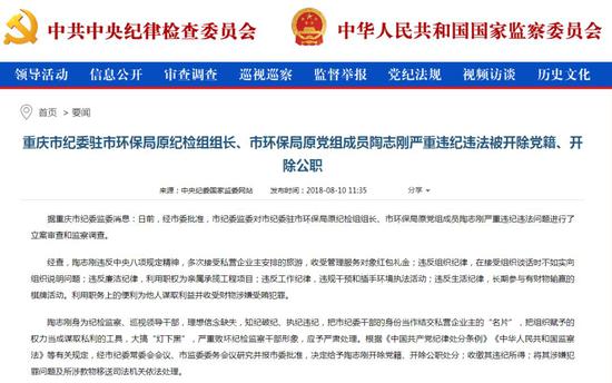 陶志刚8月被双开。双开通报中说他违规干预和插手环境执法活动。而且,通报中提及: