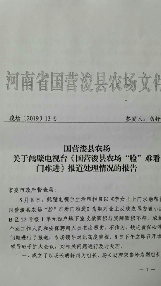 据国营浚县农场浚场[2019)13号关于鹤壁电视台《国营浚县农场“脸”难看门难进》报道处理情况的报告显示:5月8日,鹤壁电视合生活帮栏目以《国营浚县农场“脸”难看门难进》为题对业主反映农垦安置小B区22号楼1单元西户地下室收款面积与实际面积不符,农场个别工作人员和安保聘用人员态度恶劣、不作为、缺乏责任心等问题进行了报道,农场领导对此高度重视,当天下午立即召开场领导班子扩大会议,对相关问题进行及时处理。