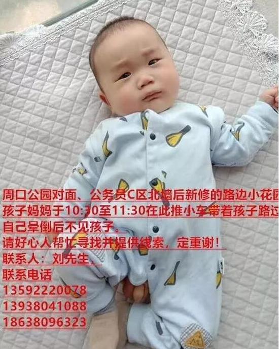 16日下午,周口市公安局文昌分局发布警情通报:2019年5月16日上午11时45分,周口市公安局文昌分局接到群众朱某报警称,其妻子带着4个月大的男孩子在周口市川汇区文昌大道周口公园对面绿化带中间小路上散步时晕倒(患有低血压钾病,有晕倒史),醒后发现孩子失踪。