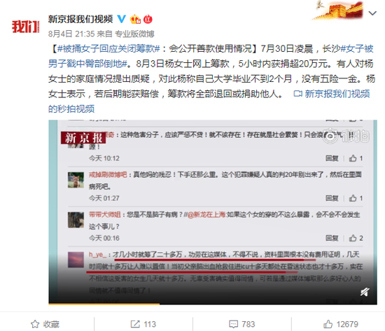 [#被捅女子回应关闭筹款#:会公开善款使用情况]7月30日凌晨,长沙#女子被男子戳中臀部倒地#。8月3日杨女士网上筹款,5小时内获捐超20万元。有人对杨女士的家庭情况提出质疑,对此杨称自己大学毕业不到2个月,没有五险一金。杨女士表示,若后期能获赔偿,筹款将全部退回或捐助他人。